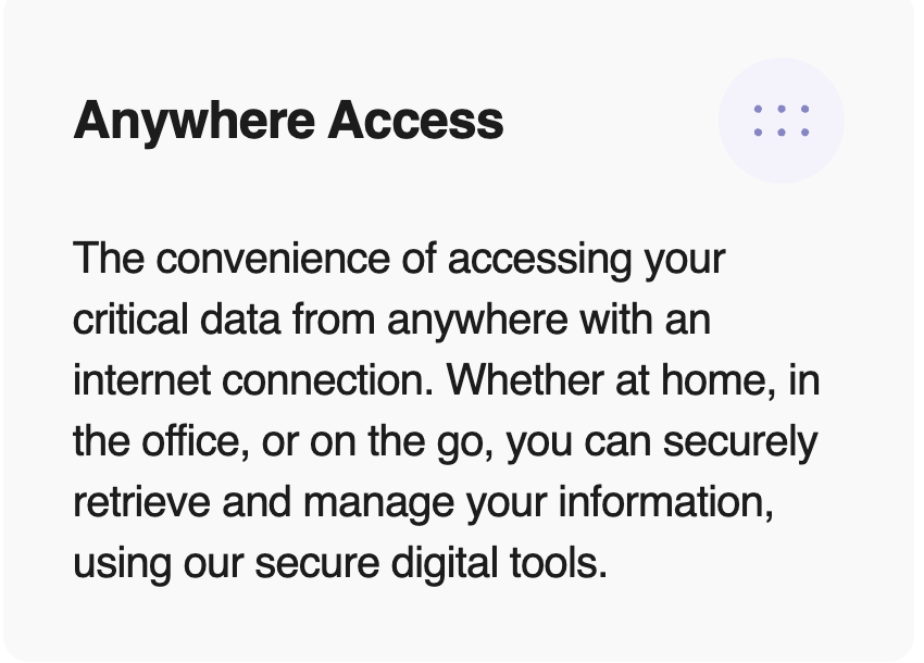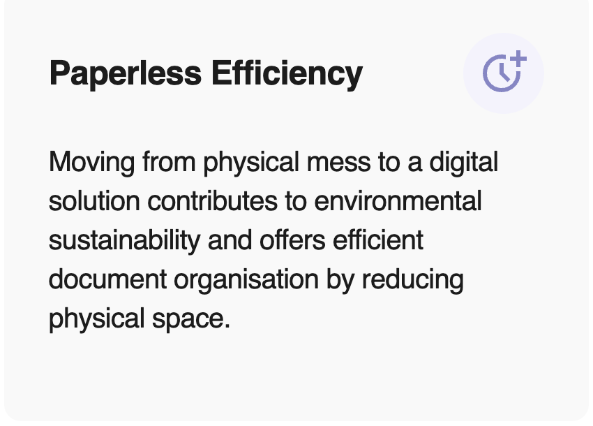 Store everything important in one place. Replace mountains of paper and rows of filing cabinets by storing your paperwork in one location, saving you countless hours trying to find necessary documents. Utilising cutting-edge hardware technology, your data remains exclusively accessible to you through encrypted storage.